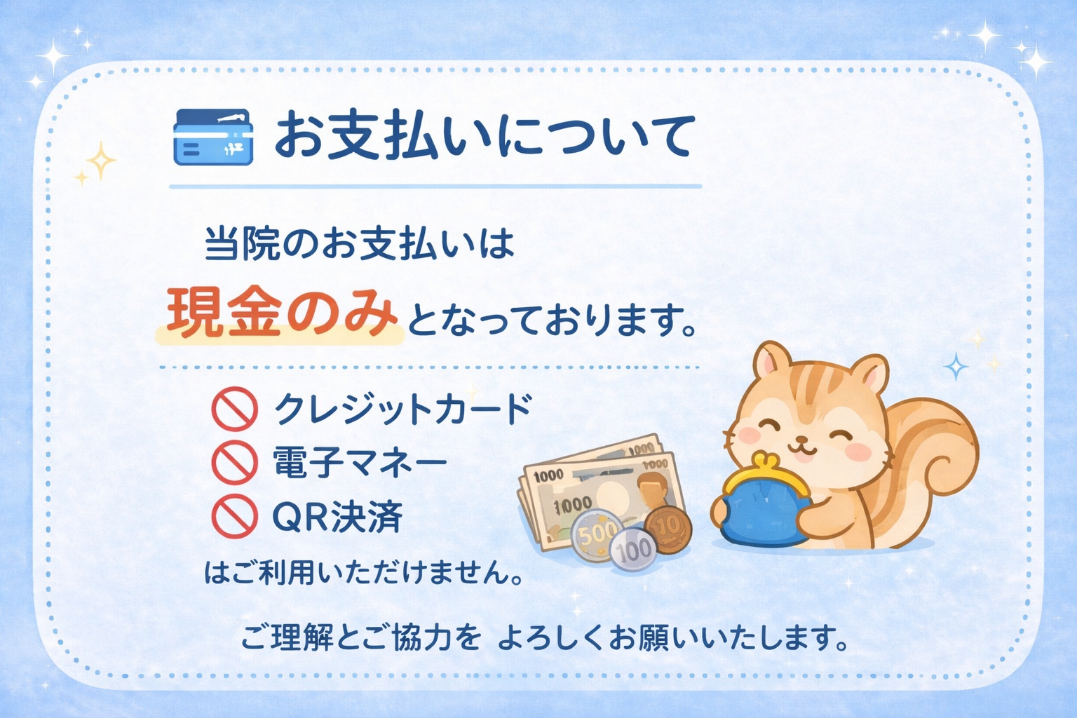 ご来院前に現金のご準備をお願いいたします。
